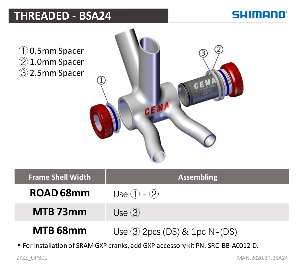 With this BSA bottom bracket you can install a Shimano or any other 24 mm crankset in a BSA frame. Replacing among others BB-MT501, SM-BB52, BB-RS500, BB-RS501, SM-BBR60, BB-R9100, BB-MT800, BB-MT801, SM-BB93
