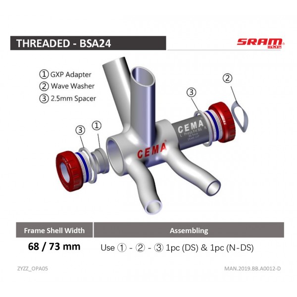With this BSA bottom bracket you can install a SRAM GXP crankset in a BSA frame.